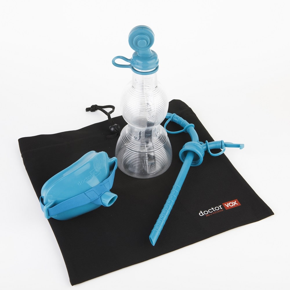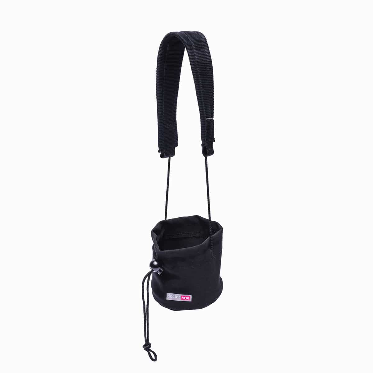 Komplette Ausrüstung für das Singen und Sprechen mit der StimmMaske by doctorVOX. In diesem Set sind die Umhängetasche und der Stoffbeutel mit dabei. Die Umhängetasche kann in der Länge individuell eingestellt werden und ermöglicht so eine optimal aufrechte Haltung. So sind die Hände frei, beispielsweise für unterstützende Bewegungen oder wenn man sich am Klavier begleiten möchte.