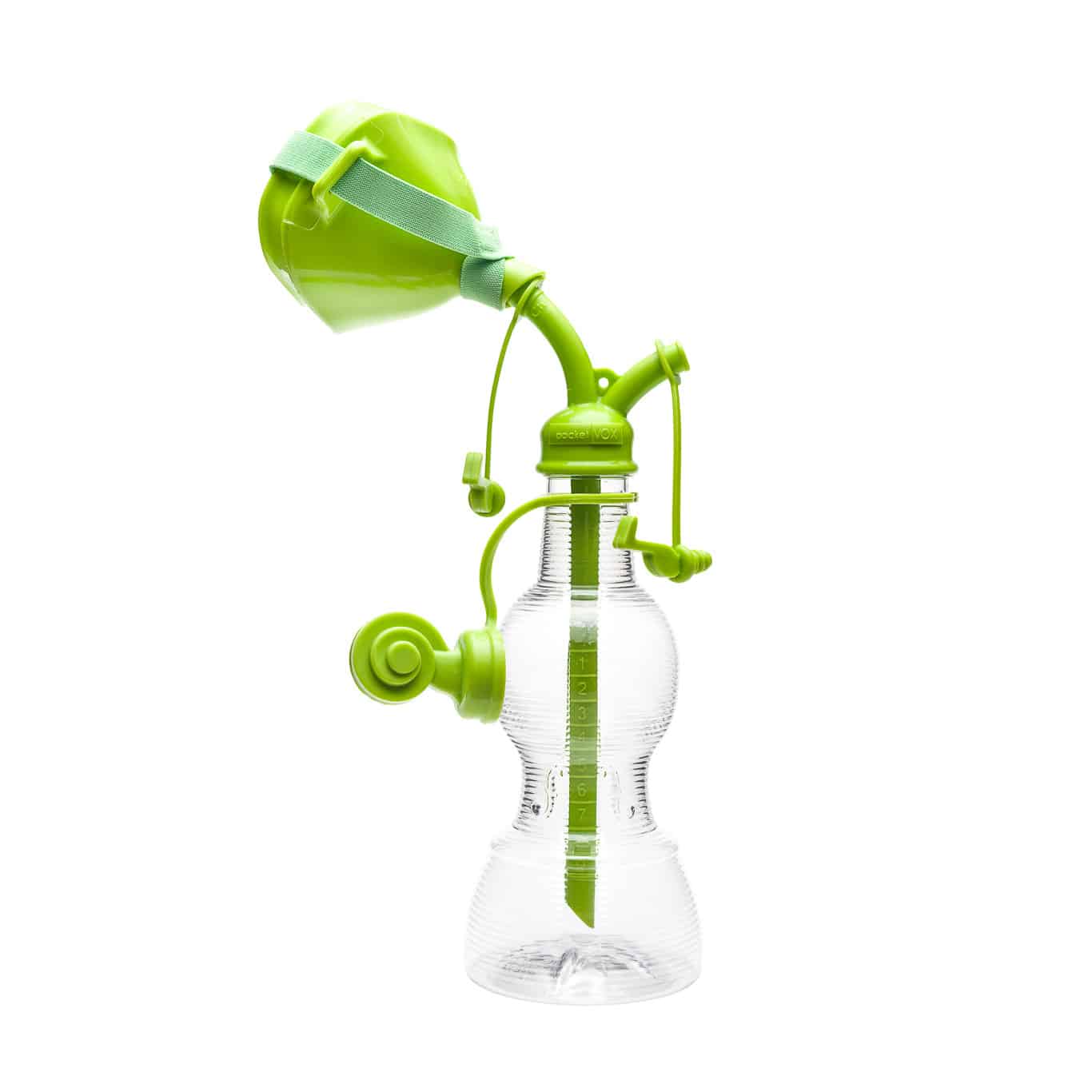 Die StimmMaske besteht aus einer Silikonmaske, die mit einem Schlauchteil verbunden wird. Diese Kombination wird auf die mit Wasser gefüllte Flasche aufgesetzt. Beim Sprechen und Singen durch die Maske bringt die Ausatmungsluft das Wasser zum Blubbern.
